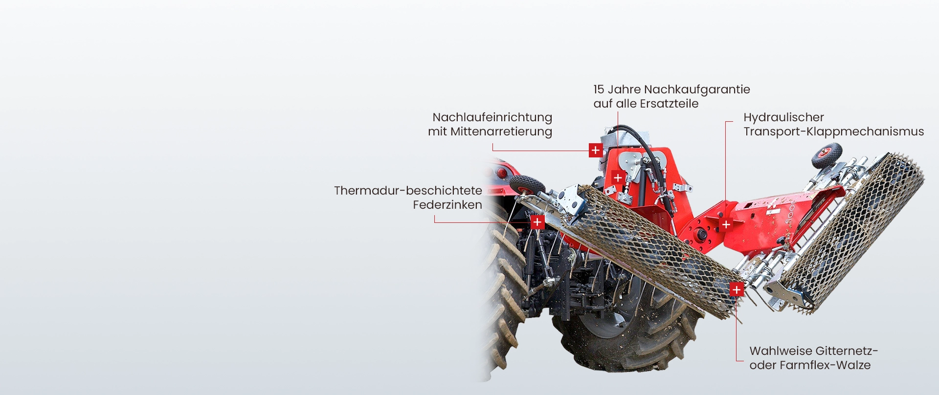 Durch seinen Klappmechanismus wird die Bahnplaner Breite auf etwa 1,9m verkleinert, so dass auch Standard-Torbreiten kein Problem mehr sind. Die Hydraulik der Schwenkarme wird entweder durch das Zugfahrzeug oder auch durch eine am Planer montierte Elektro-Ölpumpe versorgt.Â