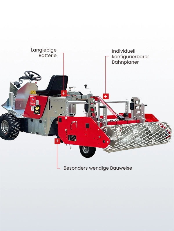 Der 100% elektrische E-Slim ersetzt Quad oder Traktor. Mit unserem neusten Produkt bekommen Sie eine Lösung, die perfekt für enge Flächen ist. Die langlebige Batterie reicht für mehrere Pflegedurchgänge. Die Bedienung ist bewusst einfach gehalten.