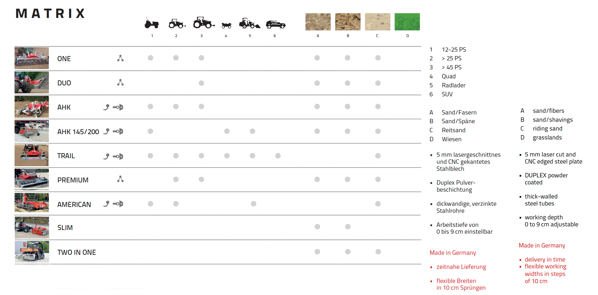 The floor-care tools are designed to loosen, mix, level and grade uneven and compacted horse footings of all kinds: sand floors equipped with fleece, geotextile, wood chips and clay contents. Easy to handle, robust, compact and modular build according to made in Germany quality standards these tools offering, at best ratio of price and performance, an innovative maintenance technology to professional and private riding arena owners.