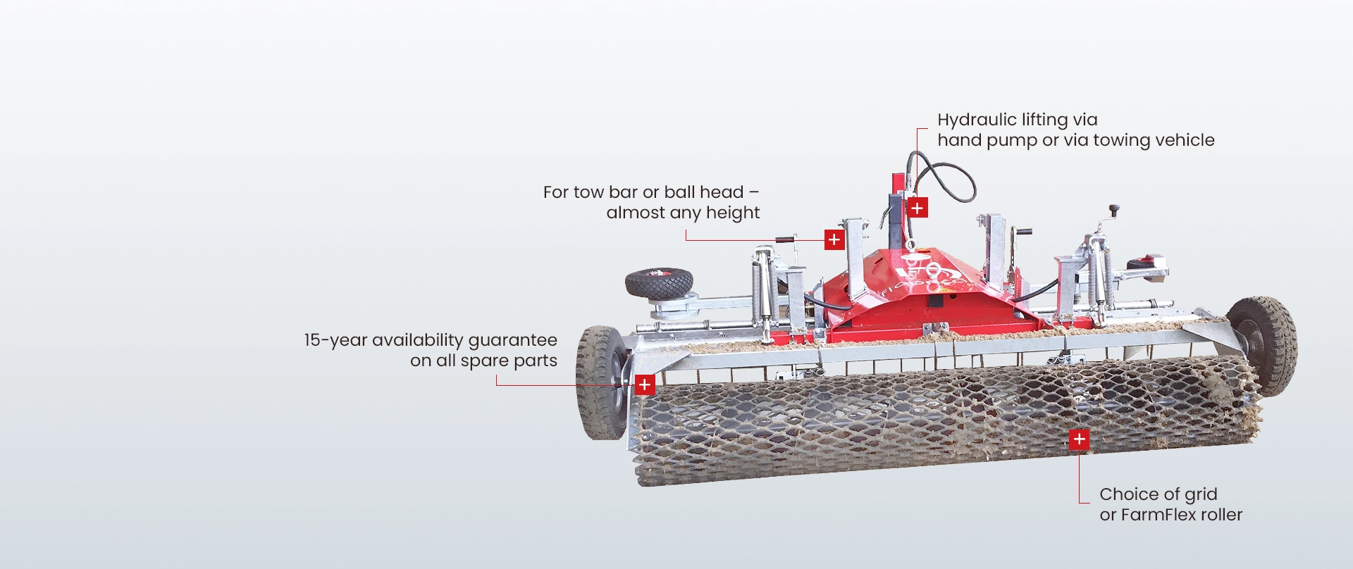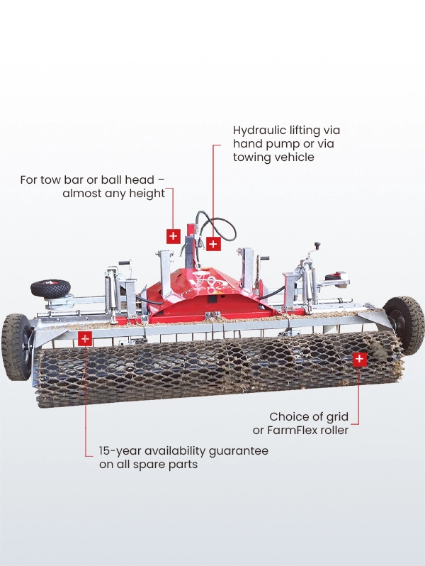 The lifting device enables easy maneuvering and simple in-house transport. It is conveniently operated from the towing vehicle (if you have a hydraulic connection). If this is not the case – as with most quads, for example – you can order our manual lifting pump. Simply get off and use a few simple steps to bring your arena groomer into the transport or working position.