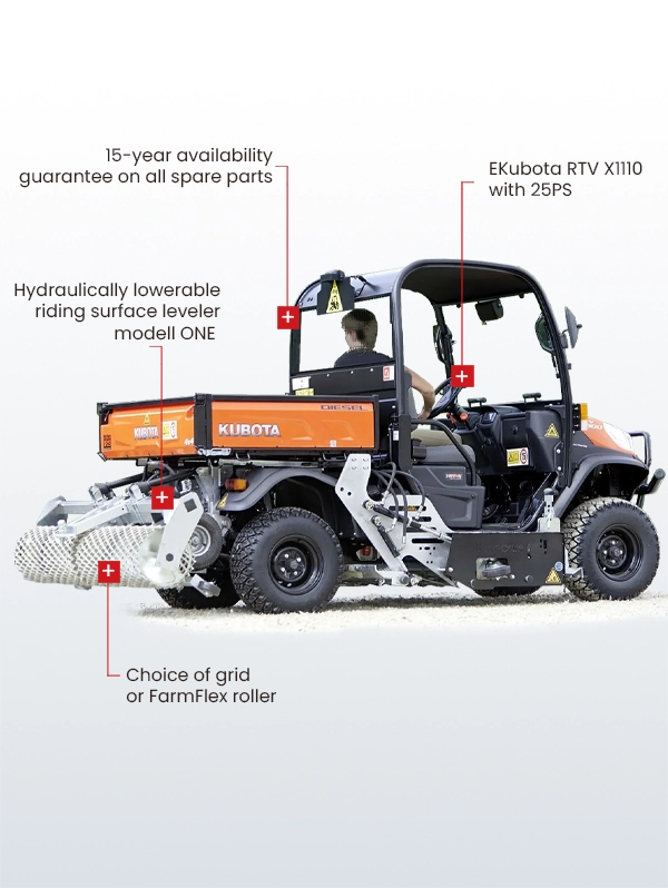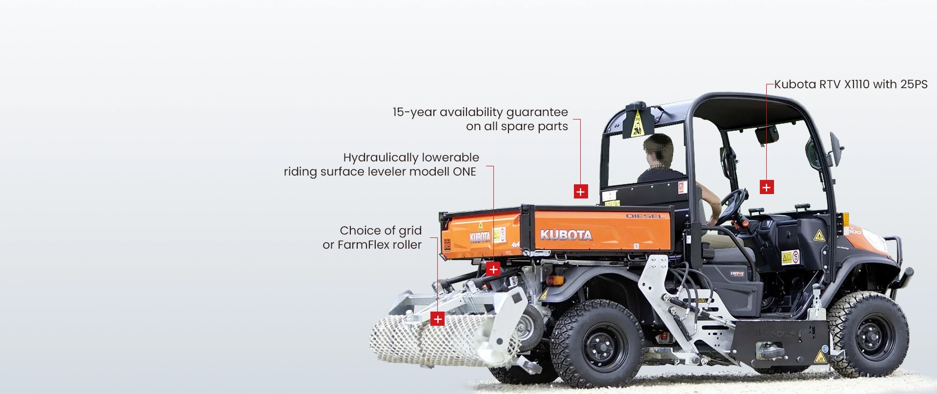 With the TWO in ONE, we show what is technically feasible. The combination of ATV as a tractor and arena groomer was completely developed in-house by us. The TWO in ONE combines simple operation, best handling and perfect riding arena maintenance – on almost any surface.