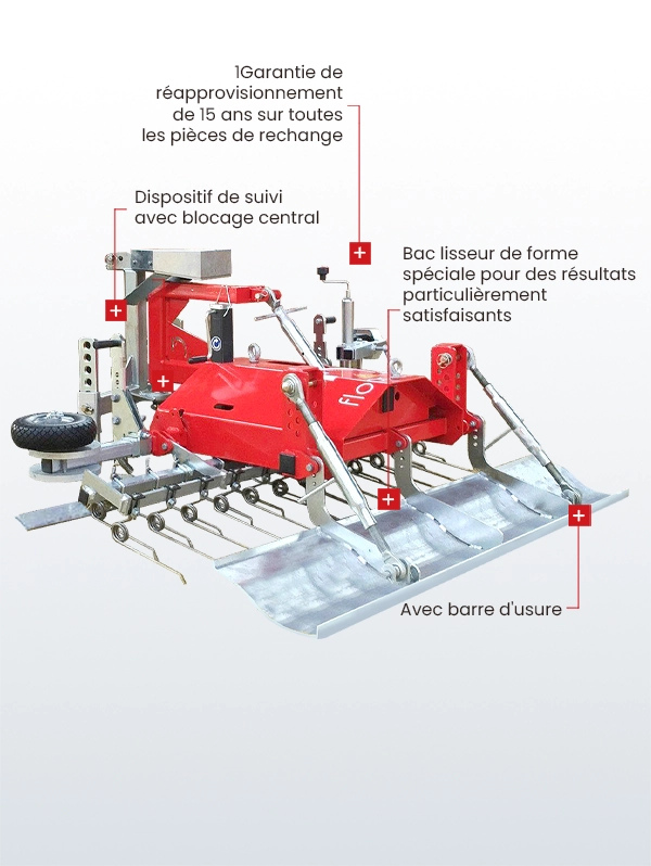 Le dispositif de suivi assure un comportement de travail équilibré dans les virages. Pour le transport, le préparateur de pistes peut être fixé en toute sécurité grâce au verrouillage central.